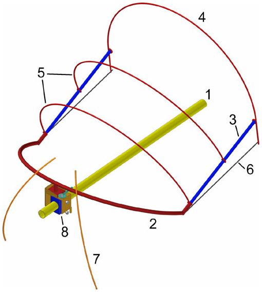 In den Rohren laufen Gummiseile, wie in modernen Zeltgestängen, so dass die Stangen beim Zusammenfalten immer verbunden bleiben. Zwei gebogene Glasfaserstäbe (5) sind über Stahldrahtösen auf den seitlichen Rohren (3) verschiebbar. Dem Fahrer zugewandt befindet sich ein dritter Bügel (4) aus Stahldraht, der unten über die seitlichen Rohre (3) hinaus steht. Ein Gummiseil (6) zwischen den Enden dieses Bügels (4) und den Enden des U-förmigen Rohres (2) zieht den Verkleidungsstoff glatt.