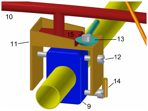 Die Bügel (2), (4) und (5) bilden zusammen mit zwei gebogenen, schwenkbaren Stahldrähten (7) einen Tunnel, über den Polyethylen-Kunststofffaserpapier (PE-Spinnvlies Tyvek® z. B. von Modulor) gespannt ist. Die Kupplung (8) besteht aus einer am Rahmen (1) befestigten Hydraulikschlauchschelle (9), deren obere Schraube (12) zugleich als Schwenkachse dient und deren untere Schraube zusammen mit einem Stift (14) als Kippbegrenzungsanschlag dient. Ein hartgelötetes Stahlteil (11), an dem eine am Bügel (10) befestigte Platte (15) mit einer Exzenterscheibe (13) festgeklemmt ist.