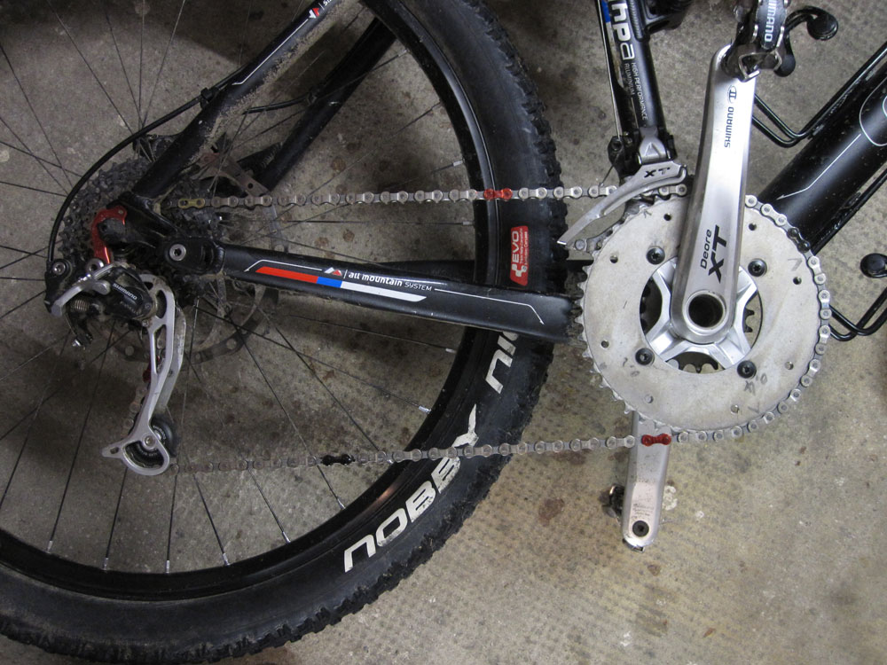Als Testfahrzeug habe ich eines meiner Mountainbikes gewählt, das noch einen – hüstel – altmodischen Neunfach-Antrieb hat. Schaltwerk und Umwerfer (Shimano XT, M-77x) haben etwa 800 km auf dem Buckel; die Antriebsverschleißteile sogar nur etwa 100 km bei trockenem Wetter, sind also technisch fast neuwertig: