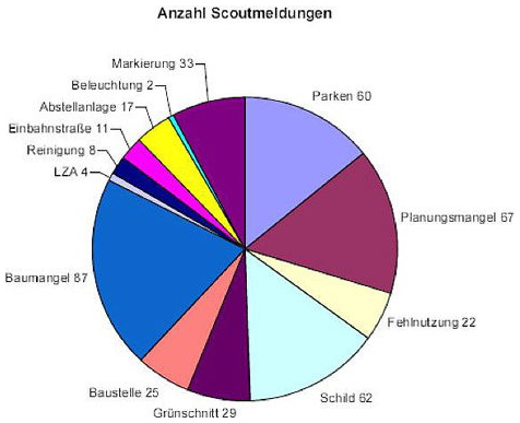 Der erste – und bislang einzige – vom Amt für Verkehrsmanagement vorgestellte Erfahrungsbereicht macht deutlich, dass von den bis zum 8. Mai 2009 über 400 gemeldeten Radwegemängeln rund 300 von den Radwegescouts stammen und ca. 120 Mängel von anderen RadfahrerInnen gemeldet wurden. Der Erfahrungsbericht offenbart zugleich, dass bau- und planungstechnische Mängel, Mängel in der Beschilderung und illegales Gehwegparken für die meisten Mängelmeldungen verantwortlich sind. Die bildliche sowie zahlenmäßige Darstellung der gemeldeten Radwegemängel erlaubt jedoch keine Aussagen über Ursache und Schwere des einzelnen Mangels, so dass für die Öffentlichkeit sowie die Radwegescouts keine Einschätzung darüber möglich ist, wie die vom Amt für Verkehrsmanagement als »ablehnungswürdig« befundenen Radwegemängel zu beurteilen sind.