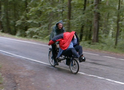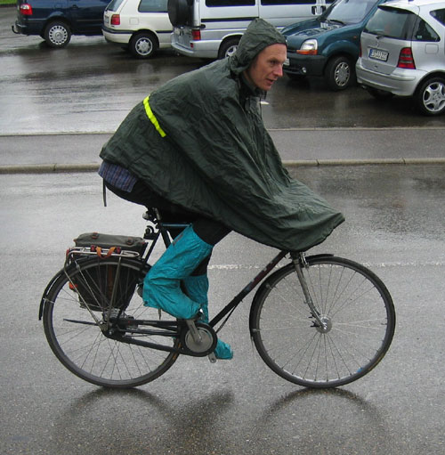In der ersten Zeit benutzte ich bei Regen einen Poncho. Die Nachteile waren nach wenigen Tagen offensichtlich. Der Poncho produziert einen großen Windwiderstand und wenn die Plane über dem Lenker liegt (so ist das gedacht), dann sammelt sich vor einem in der dort entstehenden Senke ein beachtliches Wasserreservoir, was bei jeder Bremsung auf die Füße schwappt. Auch wenn man das Rad verlässt, fließt das gesammelte Wasser über die Unterschenkel.