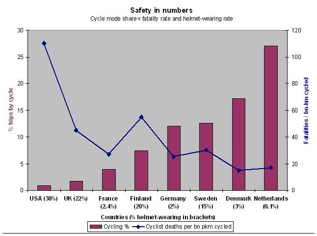 Je mehr Radfahrer es gibt, je mehr Radfahrer gesehen werden, desto mehr wird mit ihnen gerechnet und desto mehr werden sie im öffentlichen Raum akzeptiert. In Folge wird mit ihnen angemessen, d. h. gefährdungsärmer, interagiert. Länder mit hohem Radverkehrsanteil haben ein niedriges Risiko, traditionell auf das Auto setzende Länder mit geringem Radverkehrsanteil ein höheres Risiko.