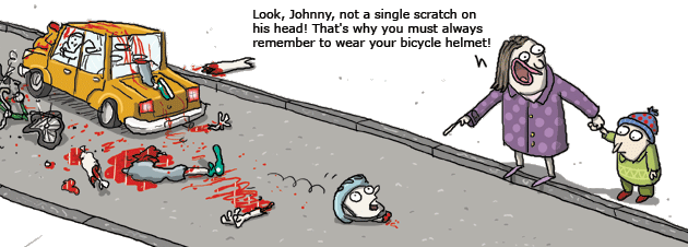 Eine Helmpflicht ist, insbesondere als Sonderbehandlung für Radfahrer, nicht notwendig, da das Kopfverletzungsrisiko von Radfahrern sich nicht von dem von Fußgängern und Autofahrern unterscheidet. Radfahrer unterliegen auch insgesamt keinem höheren Risiko als z. B. Autofahrer. Für diese, also Autofahrer und Fußgänger, wird aber keine Helmpflicht gefordert, bzw. Forderungen danach werden belächelt [1] oder als »abstrus« abgetan.