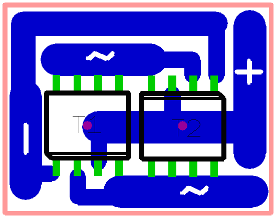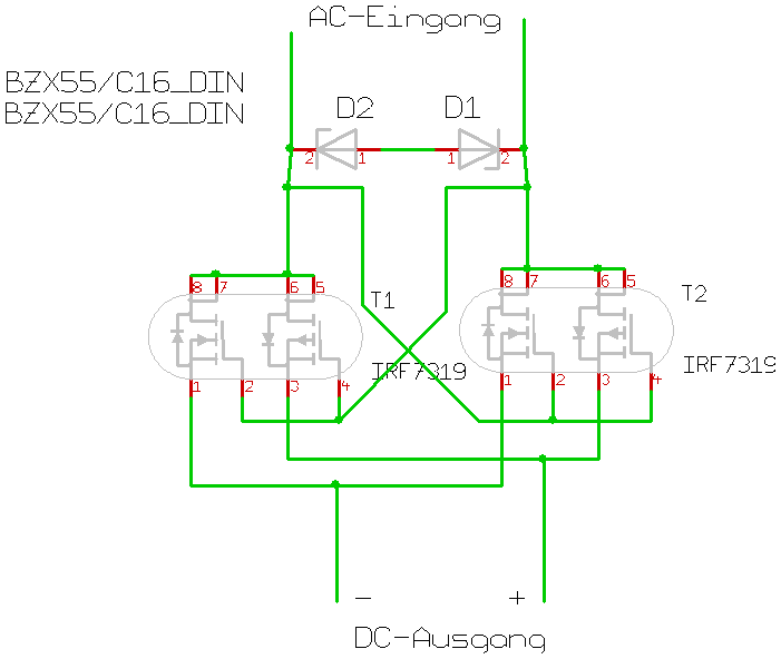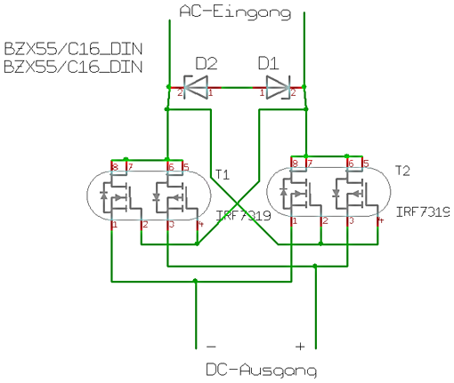 Weil nun die Gates die volle Wechselspannung aushalten müssen, darf die Spannung 20 V nicht überschreiten. Das wird erreicht durch zwei antiseriell geschaltete Zenerdioden von je 16 V, die parallel zum Wechselspannungseingang gelegt werden.