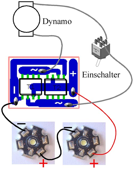 Maximal können vier Stück 3-Watt-LEDs (oder eine MC-E mit in Reihe geschalteten Chips) am Gleichrichter angeschlossen werden. Mehr ist wegen der begrenzten Leistungsfähigkeit der Dynamos nicht sinnvoll, und bei vier LEDs nähert man sich auch der Spannungsfestigkeit der Mosfets.