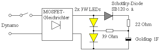Seit LEDs für die Radbeleuchtung verwendet werden, besteht die Notwendigkeit, die Wechselspannung des Dynamos gleichzurichten. Dies muss möglichst effizient geschehen, stehen doch nominell lediglich 3 W aus 6 V zur Verfügung. Gleichrichter mit Silizium-Dioden sind zwar günstig und robust, verursachen aber einen Spannungsabfall von mehr als 1 V. Schottky-Dioden sind zwar etwas besser, aber 0,5 bis 0,8 V sind es auch dort.