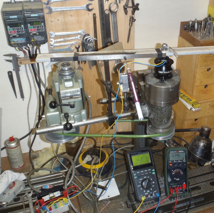 Das Messprinzip blieb das gleiche: Die Nabendynamos werden mit einem Speichenflansch in das Futter einer kleinen Drehbank eingespannt und bei verschiedenen Drehzahlen betrieben. Auf die Nabenachse wird mittels Schnellspanner ein Hebelarm aus Aluminium gespannt und in 100 mm Abstand zur Achse die Abstützkraft des Hebels gemessen. Während im früheren Test die Nabenachse horizontal angeordnet war, wird diesmal mit vertikaler Achse gemessen. Die Abstützkraft wird mit einer Federwaage (Pesola, Messbereich 0–600 g, Auflösung 1 g) anstatt einer Laborwaage gemessen. Vorteil des neuen Aufbaus ist die entfallende Nullpunktkalibrierung und das einfachere Ermitteln von Mittelwerten bei durch Resonanzen schwankenden Stützkräften. Die Drehzahl wird durch Messung der Generator-Frequenz bei bekannter Polpaarzahl ermittelt. Aus Drehzahl, Hebelarm und Stützkraft errechnet sich die Antriebsleistung.