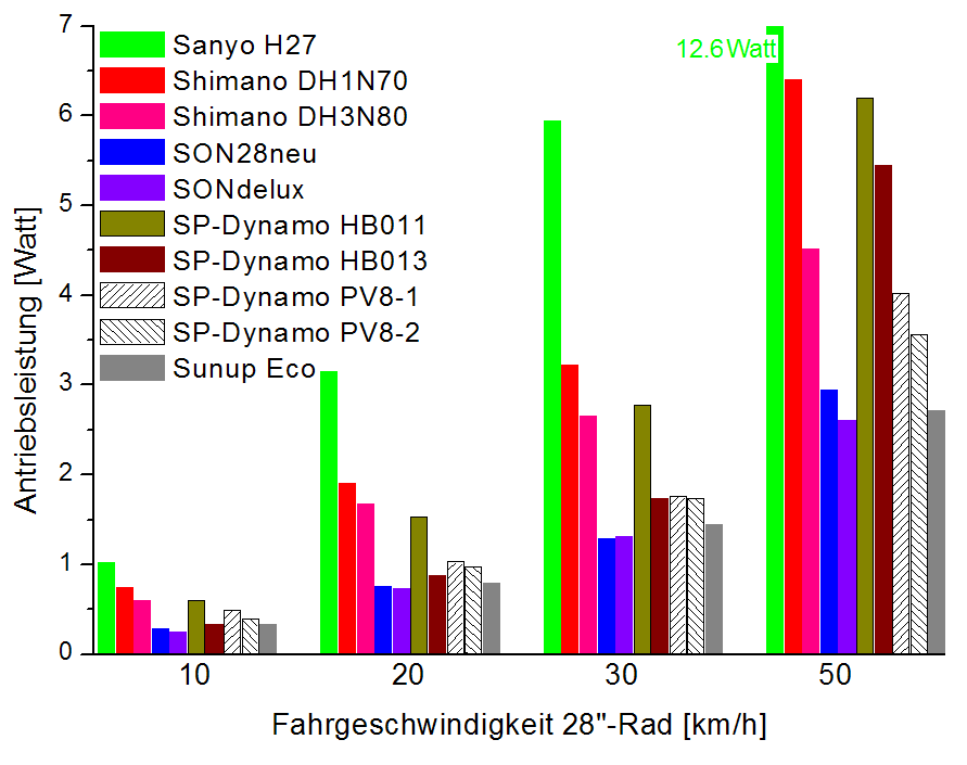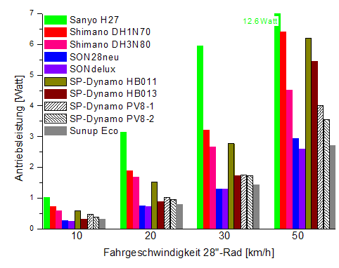 Betrachtet man die Antriebsleistung bei 12 Ω Last fällt erwartungsgemäß der Shimano DH-1N70 durch leichten Lauf auf. Der Wirkungsgrad ist aber bei Tempo 30 mit 32 % nicht überwältigend.