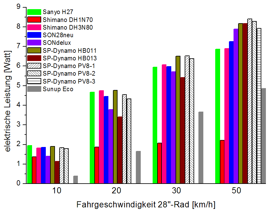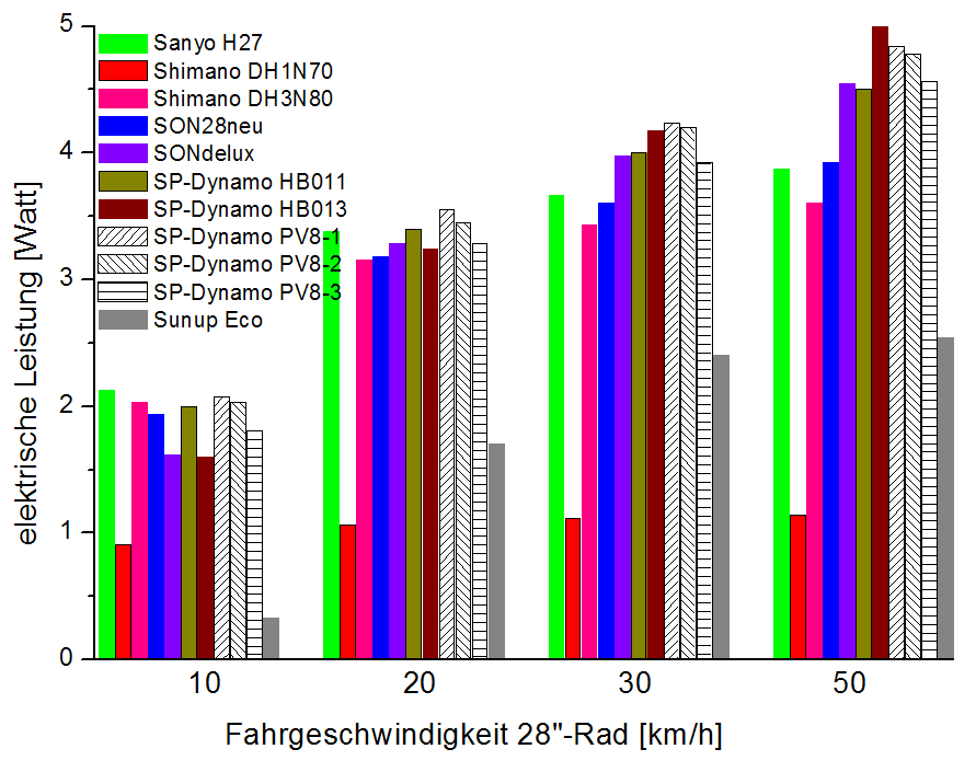 SONdelux und HB013 liefern bei Tempo unter 30 km/h am Doppelscheinwerfer stets etwas weniger Leistung als die anderen. Bei schneller Fahrt bleiben hingegen Sanyo H27 und Shimano DH-3N80 ein wenig zurück.