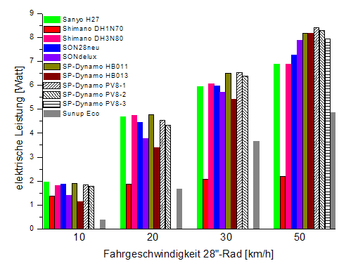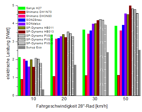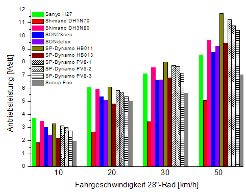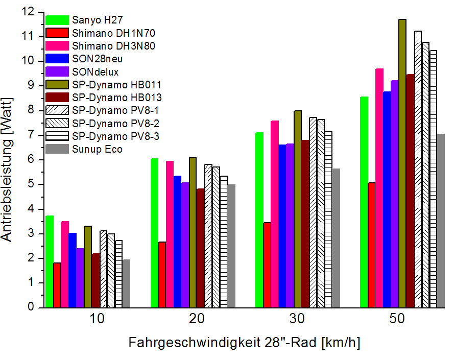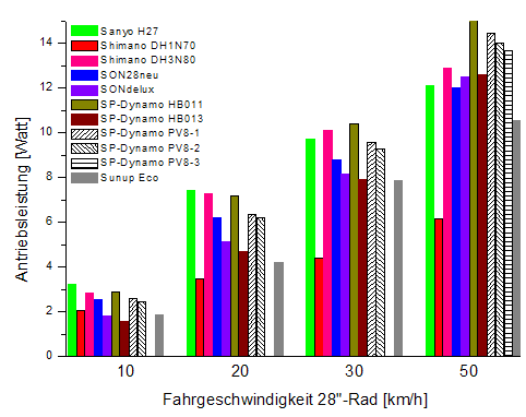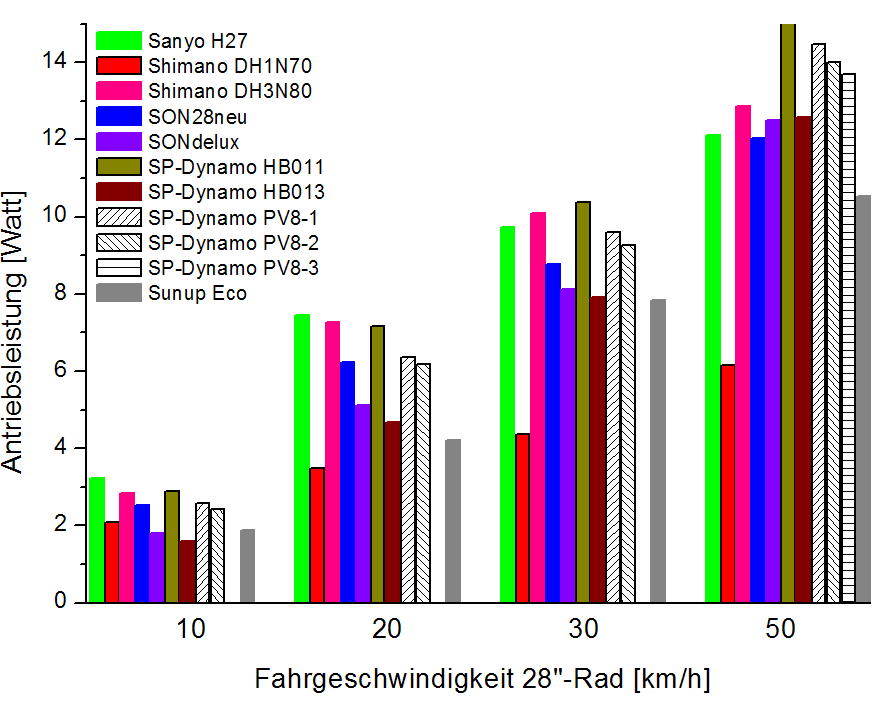 Am leichtgängigsten im Leerlauf sind die Modelle aus Tübingen, wobei der kleinere SONdelux kaum besser als der neue SON28 abschneidet. Mit ca. 1 W bei Tempo 30 sind das etwa 0,5 % der gesamt nötigen Antriebsleistung, um ein Fahrrad in sportlicher Sitzhaltung zu bewegen.