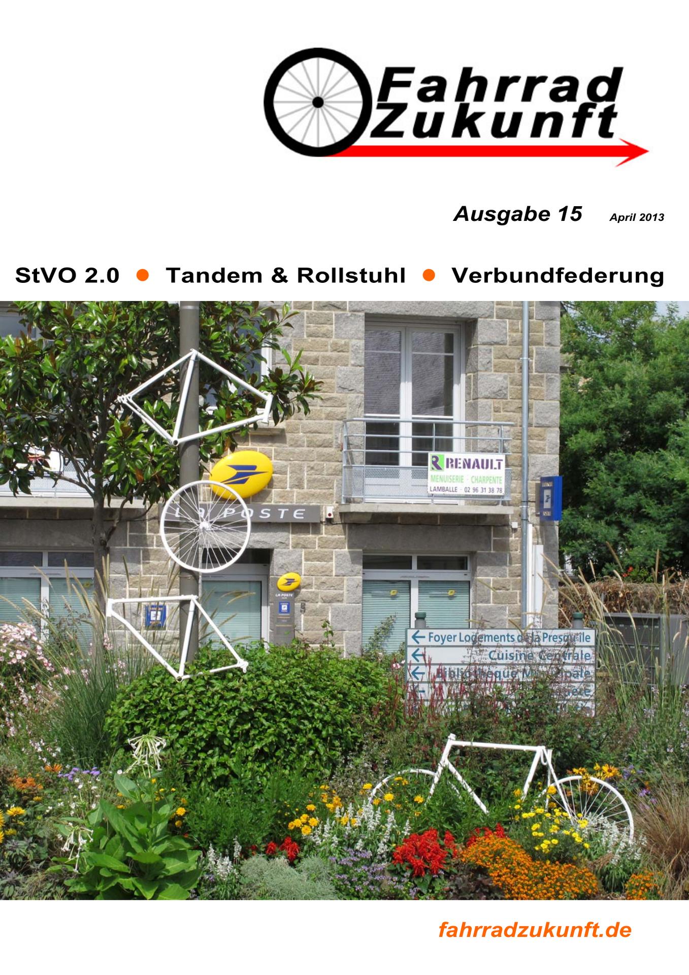 Nun ist sie endlich da, die 15. Ausgabe der Fahrradzukunft. Es hat schon wieder fast ein Jahr gedauert, aber wenigstens nur fast. Hindernis eins gegen kürzere Abstände ist ein gewisser Mangel an Artikeln. Es dauert einfach bis wir genügend Material für eine Ausgabe zusammen haben. Daher hier nochmal der Aufruf: Schreibt für Fahrradzukunft!