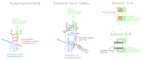 Zum einen wird die Biegebeanspruchung durch die Einbettung im Gepäckträgerunterteil besser verteilt, zum anderen ist im oberen Bereich des Aluminiumteils der Bereich, in dem Scherbeanspruchung auftritt, mit größerem Querschnitt ausgeführt.