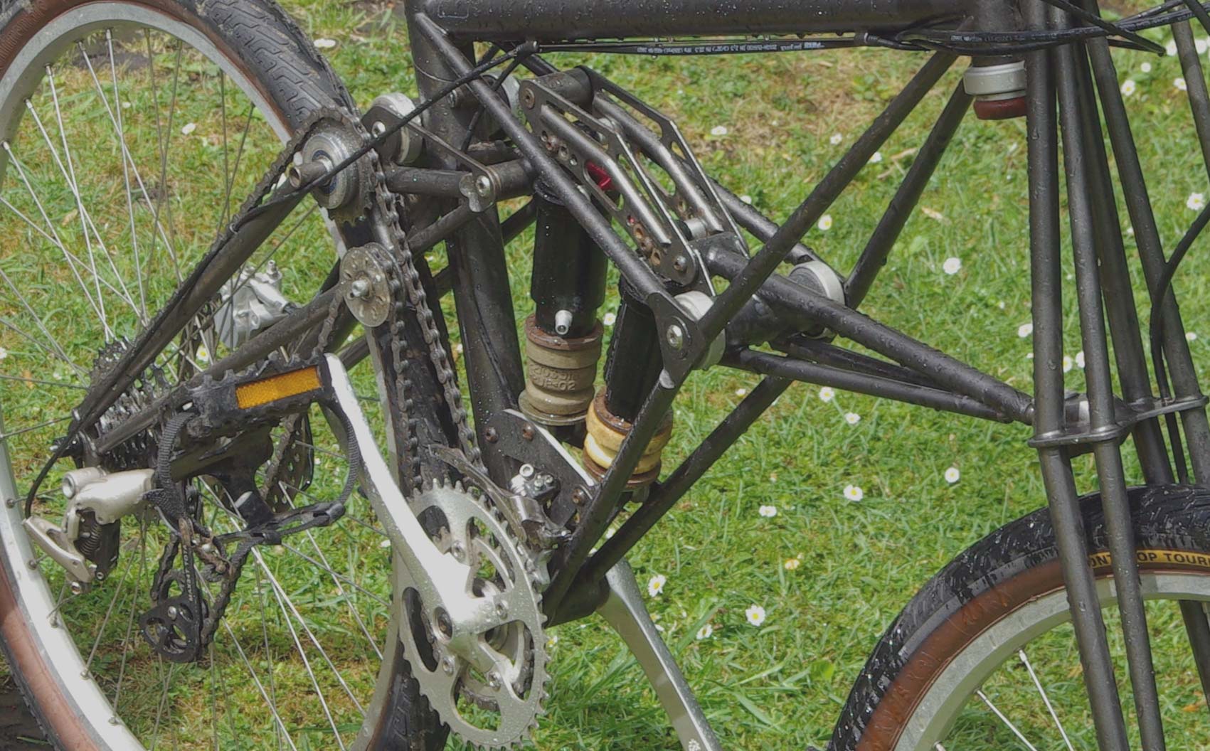 In gewisser Weise fahren wir alle mit dem Rad mit verbundenem Federungssystem: Wenn wir uns einer Fahrbahnunebenheit (einem Schlagloch oder Buckel) nähern, heben wir uns zuvor aus dem Sattel. Das ist mehr als purer Selbstschutz, denn wenn wir gleichzeitig den Halt am Lenker lockern, erlauben wir damit dem Fahrrad, sich unter uns – mit dem Tretlager als Drehpunkt – rück- oder vorwärts drehend dem Hindernis auszuweichen.