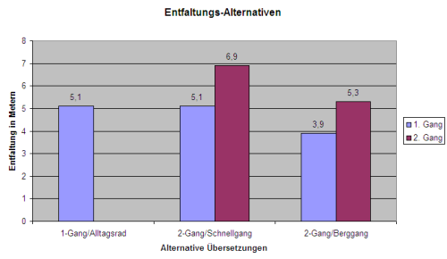 Zur Realisierung dieser vergleichsweise kleinen Entfaltung ist ein kleines Kettenblatt mit ca. 35 Zähnen bei einem 19er Ritzel erforderlich. Der 2. Gang als Normalgang hätte dann eine Entfaltung von ca. 5,3 m, was bei diesem Kettenblatt einem 14er Ritzel entspräche. Alternativ könnte ein Kettenblatt mit 37 Zähnen mit einem 21er Ritzel kombiniert werden. Dies alles gilt bei einer Laufradgröße von 28″; bei anderen Laufradgrößen verweise ich zur Berechnung der Übersetzung auf die genannten Ritzelrechner im Internet.