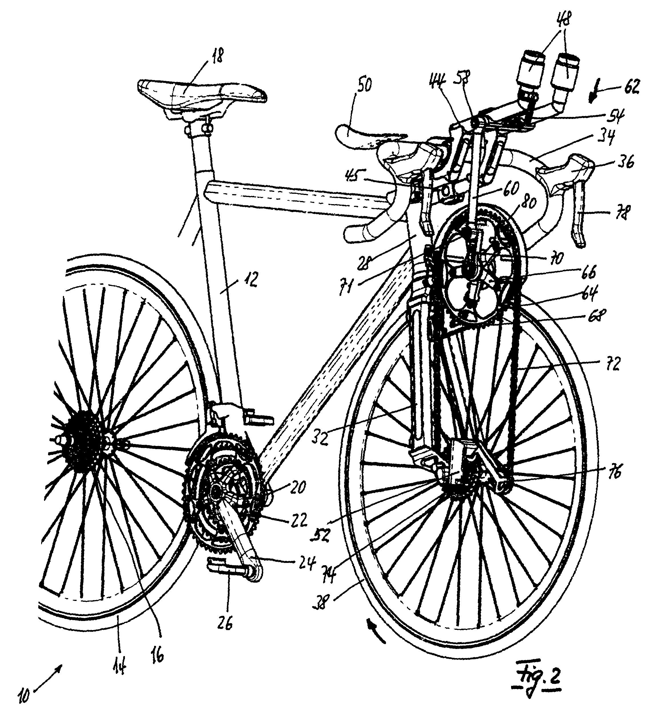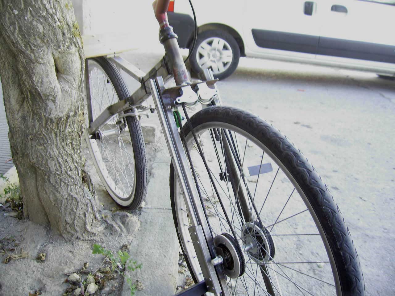 Der Lenkkopfwinkel der aktuellen Prototypen beträgt etwa 51 Grad. Die ersten Prototypen hatten etwa 57 Grad. Normalerweise bestimmen der Lenkkopfwinkel und der Nachlauf Handlichkeit und Geradeauslauf. Beim MAYNOOTHBIKE kommt hinzu, dass der Lenkkopfwinkel gleichzeitig den Winkel bestimmt, in dem die Pedale getreten werden. Ich bin dieses Problem eher mit praktischen Versuchen als mit wissenschaftlichen Berechnungen angegangen. Durch die kleinen Räder und den durch die Antriebsritzel bedingten Abstand von Gabelmitte zur Vorderradachse hat das Maynoothbike einen relativ geringen Nachlauf. Nur bei sehr geringen Geschwindigkeiten und großem Lenkeinschlag tritt ein leichter »Choppereffekt« auf.