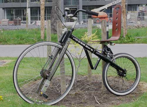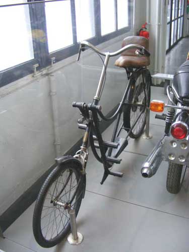 Das Bild zeigt eine sehr frühe Version vom MAYNOOTHBIKE. Die Verwendung eines Seiles war verlockend, weil ein Seil anders als eine Kette in verschiedene Ebenen umgelenkt werden kann. Es hat funktioniert, aber nicht gut genug. Bis zu acht Zentimeter des Pedalweges wurden benötigt, um Zug auf das Seil zu bringen. Ein formschlüssiges Zugmittel wie eine Rollenkette zieht quasi sofort.