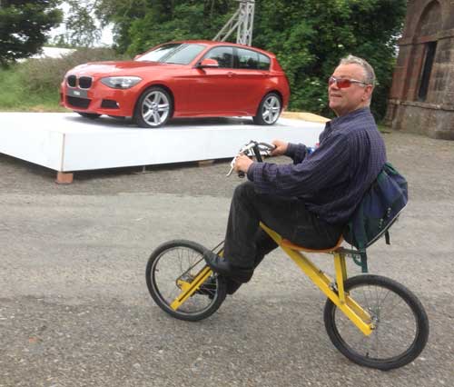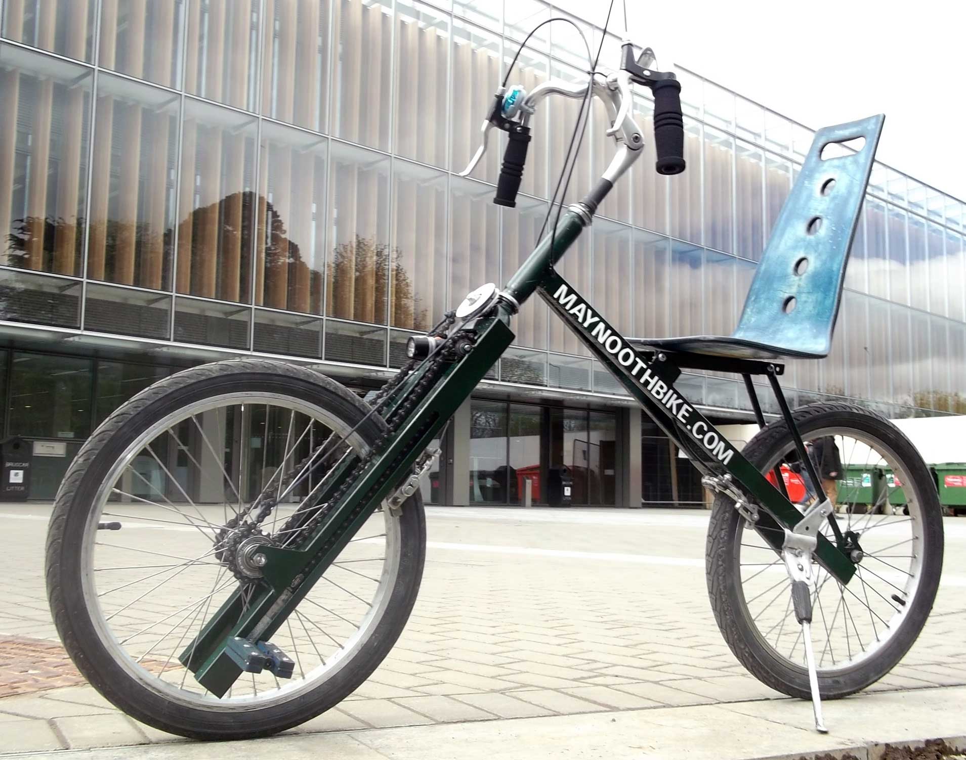 Das MAYNOOTHBIKE braucht viel Auslauf und liebt die weiten Ebenen, weil es (noch) keine Gangschaltung hat. In der Stadt ist es auch sehr angenehm zu fahren, weil man beim Ampelstopp sitzen bleiben kann. Aber um sich wirklich ein Bild zu machen, ist es am besten das MAYNOOTHBIKE einmal selbst auszuprobieren. Das war bisher ein Problem für Leute, die größer als eins siebzig sind. Vor Kurzem habe ich ein Bike mit verstellbarem Sitz und höherem Vorbau (das Gelbe) fertiggestellt. Auf der Website maynoothbike.com kann man Kommentare von Probefahrern lesen.