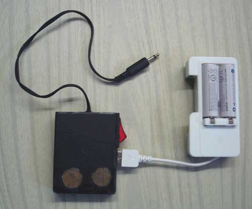 Den Anschluß zum Nabendynamo wurde kurz vor der Kabeleinführung zur Fahrradlampe an das Kabel vom Dynamo kommend angelötet. Mit etwas Kleber wurde am Lampenhalter eine 3,5-mm-Klinkenbuchse befestigt. Am Kabel zum Laders ist das Gegenstück, ein 3,5-mm-Klinkenstecker, angelötet. Befestigt ist der Lader mit Klettband am Steuerrohr des Rahmens. Auf Grund des geringen Gewichtes – 52 g – sitzt der Lader sehr fest.