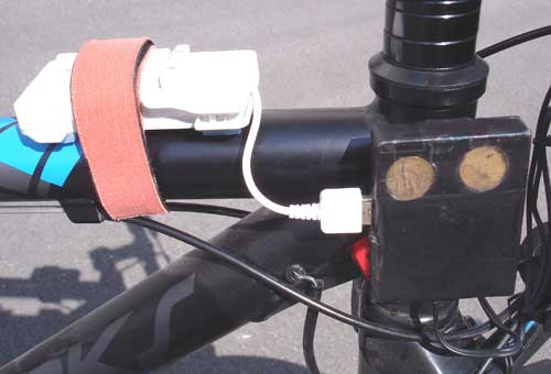 Im Internet habe ich mir aus oben genannten Gründen den Sanyo USB-Lader MDU01 mit 2 eneloop 2.000 mAh-Akkus besorgt, den ich am USB-Ausgang des Minimallader anschließe. Der USB-Lader wird mit einem Klettband am Oberrohr des Fahrrads befestigt.