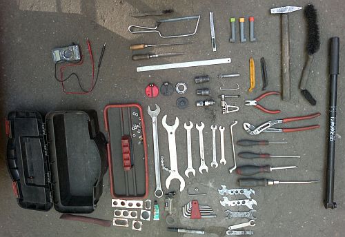 Die Werkzeugauswahl ist so knapp wie möglich, damit ich möglichst wenig Gewicht durch die Gegend fahren muss: so verzichte ich (bis auf 8/10) auf Ringschlüssel, habe außer Wasserpumpenzange und kleinem Seitenschneider keine Zangen (Abisolieren erledige ich mit dem kleinen Cutter, Schaltzughülle schneide ich Draht für Draht mit dem Seitenschneider, Schlösser knacken geht nur auf Vorbestellung) und verzichte auf uralte Schraubkranzabzieher und Tretlagerwerkzeug (da müssen die KundInnen schon vorher Bescheid geben, wenn's Tretlager dran ist. Das ist aber einer der wenigen Defekte, den die meisten richtig beschreiben).