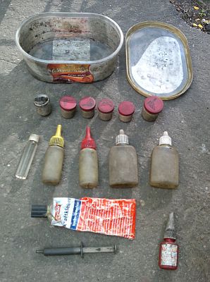 Mittlere Reihe von links nach rechts: Reinigungsbenzin, Oil of Rohloff, Ballistol, WD40, Nähmaschinenöl.