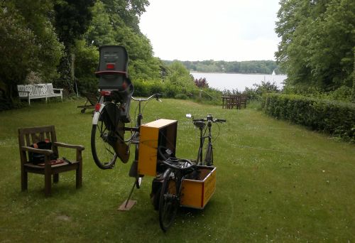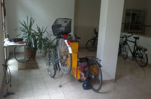 Natürlich komme ich mit dem Fahrrad zur KundIn, hierfür habe ich mir ein einspuriges Transportfahrrad selbst gebaut. Selbstverständlich würde auch ein käuflich erwerbbares Modell funktionieren, z. B. das Bullit, der Long John oder Long Harry oder das Yuba Mundo. Ein Kollege und Mitbewerber fährt auch mit seinem mit diversen Taschen und Koffern bepackten Reiserad zur KundIn. Aber einspurig sollte es schon sein, ein Dreirad ist für die (egal in welchem Ort) sicherlich zu fahrenden Streckenlängen zu schwerfällig.