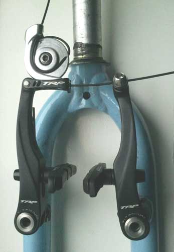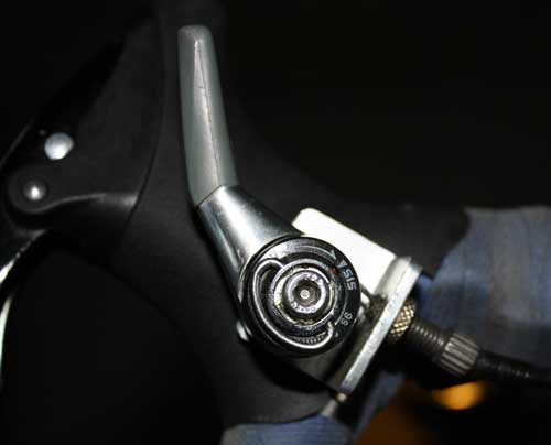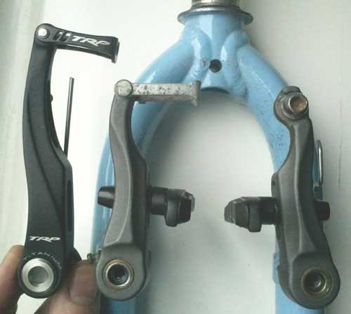 Der einfachste Weg ist jedoch in der Tat, erst einmal ganz normale Rennbremshebel auszuprobieren. Sie haben halt eine (manchmal zu) hohe Hebelübersetzung: Die Bremswirkung ist zwar sehr gut, manche mögen jedoch den weichen Druckpunkt nicht. Auch muss die Bremse sehr eng eingestellt werden, damit der Weg im Hebel ausreicht und er nicht am Lenker (je nach Form!) anschlägt, bevor die Beläge greifen. Dies erfordert wiederum penibel zentrierte Laufräder. Dazu bin ich in der Realität eigentlich zu faul.