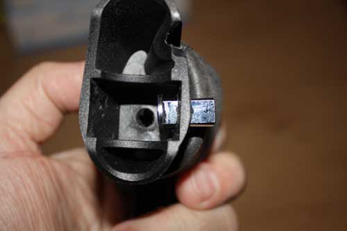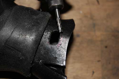 Zuerst wird die Stelle der zukünftigen Aussparung für die Gegenmutter markiert und mit einem kleinen Bohrer vorgebohrt. Dann »tastet« man sich feilend an die ovale Form der Mutter heran. Sehr hilfreich ist ein Minitool mit einem 3–4 mm Frässtift. Allerdings muss man damit besonders vorsichtig arbeiten, da das Grundmaterial schnell schmilzt.