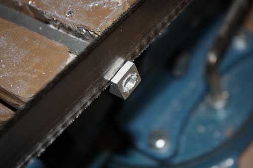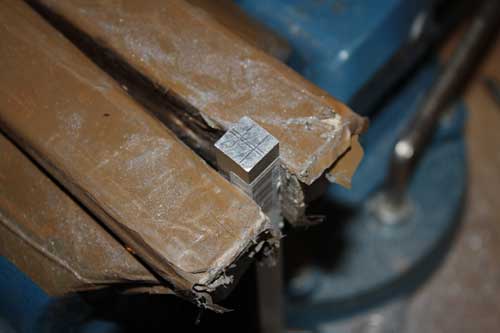 Es muss später spielfrei auf dem Oval der Gegenmutter sitzen. Dieser Schritt ist etwas fummelig, da dieses Plättchen dünn und klein (und dementsprechend schwer zu spannen) ist und dennoch bei den Außen- und Innenmaßen präzise gearbeitet sein soll. Da das Plättchen die Außenmaße 12 mm × 12 mm haben muss, hat sich der Autor die Arbeit ein wenig vereinfacht, indem er eine Aluminiumstange mit diesen Abmessungen als Ausgangsmaterial verwendet hat.