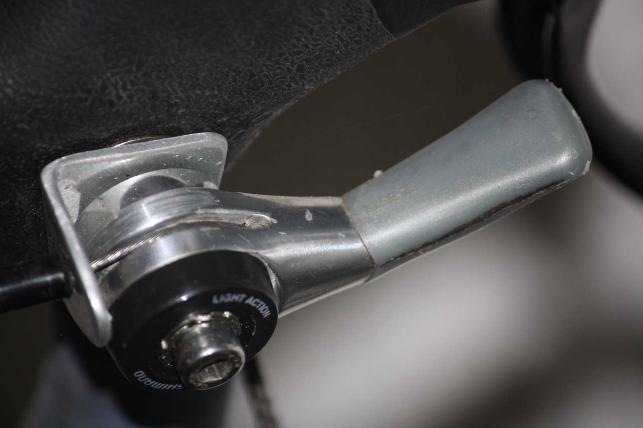 Je nach persönlichen Vorlieben kann man den Abstand zwischen Ende des Schalthebels und Bremsgriffkörper noch mittels M10er Unterlegscheiben anpassen. Aufwendiger ist es, die Achse des Hebels in Bezug zum Griffkörper etwas schräg zu stellen. Dies geht mit Distanzhaltern (z. B. aus Resten der Stange mit 12 mm × 12 mm gefertigt), die konisch gefeilt sind. Diese Plättchen müssen dabei innerhalb und außerhalb des Griffkörpers auf die Gegenmuttter geschoben werden. Damit kann die Längsachse dieser Gegenmutter in der Bremsgrifffräsung gegenüber dem Bremsgriffkörper etwas aus der Senkrechten gekippt montiert werden. Folge: Je nach Position vergrößert sich der Abstand des des Schalthebels zum Griffkörper und lässt so z. B. mehr Platz für den Daumen.