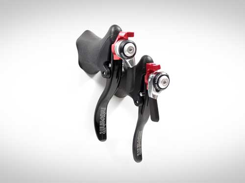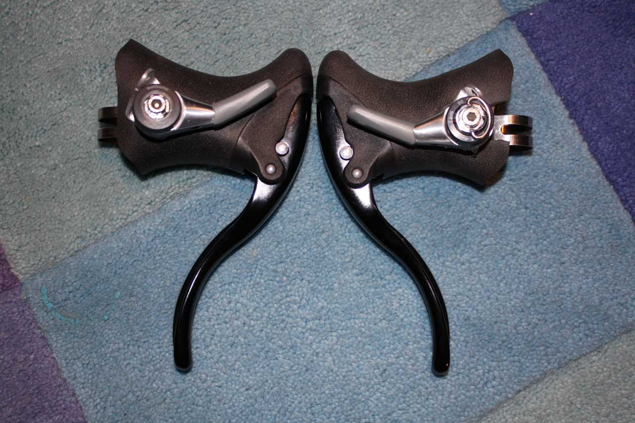 Die Wahl fiel auf den Tektro BL 520, da er für mich gut zu greifen ist und einen Griffkörper aus Kunststoff hat. Letzteres vereinfacht den folgenden Umbau sehr. Als Grundlage für die Schalthebel dienten Dura-Ace 9-fach Lenkerendschalthebel: seit Jahren auf dem Markt, robust und mit abschaltbarer Rasterung. Diese Hebel lassen sich leicht in die Innenklemmung, die darin eingeschobene »Gegenmutter« und den eigentlichen Schalthebel zerlegen.