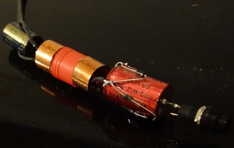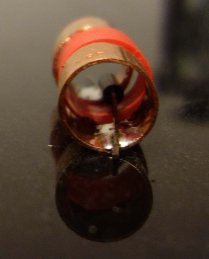 Vorne und hinten im Bild sind die beiden Kupferrohrstücke zu sehen, welche an die Zenerdiode angelötet wurden. In der Mitte befindet sich ein rotes Stück Plastikrohr, welches nur der mechanischen Fixierung der beiden Kupferrohrstücke dient. Die Anschlussdrähte der Zenerdiode wurden brückenförmig gebogen, damit bei etwaigen Querbewegungen keine allzu großen Kräfte auf den Körper der Diode einwirken.