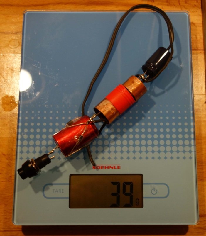 In Bild 2 ganz rechts ist ein An/Ausschalter zu sehen, dahinter folgt der Eingangs-Serienkondensator. Es handelt sich um einen 330-µF-Tonfrequenzelko von Conrad – hier könnte man noch mit verschiedenen Werten experimentieren, um den besten Wert für den Walzendynamo zu finden. Um diesen Elko herum sind die vier Schottky-Dioden angeordnet, welche den Brückengleichrichter bilden. Dahinter folgen das Zenerdioden-Element aus Bild 1 und zuletzt (ganz links im Bild) ein Elko mit 6.800 µF für die Glättung der Ausgangsspannung. Der fertige Minimal-Lader wiegt nur 39 g.