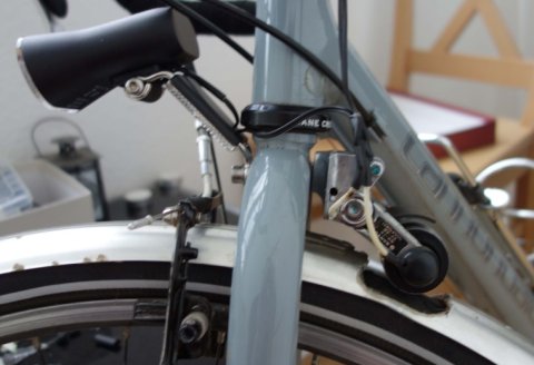 Zum einen ist ein Walzendynamo relativ laut, wenn man sonst an Nabendynamos gewöhnt ist. Zur Verringerung der Geräuschentwicklung wurde zusätzlich ein Gummistreifen auf die Walze aufgeklebt (auf dem Foto noch nicht vorhanden). Dazu kann man einen alten Fahrradschlauch aufschneiden, waschen, trocknen, mit Teppichklebeband versehen und dann um die Walze kleben. Dadurch wird der Dynamo ein gutes Stück leiser, aber natürlich nicht geräuschlos wie ein Nabendynamo.