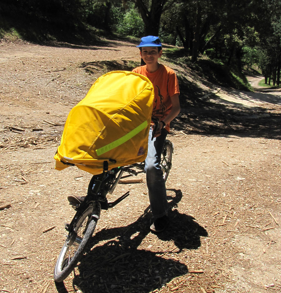 Ich fahr natürlich auch bei Regen zur Schule – dann aber nicht mit dem Regencape zum Anknüpfen an die Verkleidung, das es auch dazu gäbe. Das finde ich eher doof. Die Frontverkleidung hält aber meinen Schulranzen und andere Taschen komplett trocken – die sind nämlich selber nicht wirklich wasserdicht. Ich habe bei schlechtem Wetter eine normale Jacke an. Wegen der Verkleidung werden Schuhe und Hose nicht großartig nass.