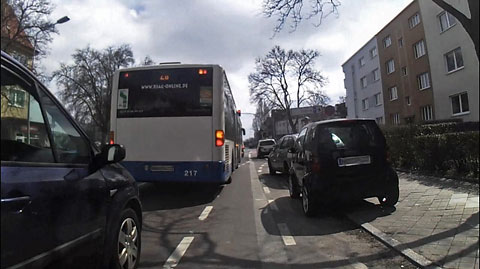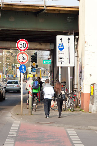 Die Karl-Marx-Straße/Dethardingstraße in Rostock ist ca. 1200 m lang und 15,50 m breit und Hauptachse für den Verkehr (PKW, Linienbusse, Radfahrer, Fußgänger). Beidseitig parken PKW halb auf den Gehwegen, die teils nur noch 1,00 m Gehbreite haben. Die Fahrspuren betragen zwischen 2,20 und 2,65 m, Parkplätze 1,60 bis 2,10 m und Sandwichstreifen 1,25 m. In einer Richtung wurden sieben verschiedene Radführungen, d. h. sieben Konfliktpunkte geschaffen. Zuerst versuchte ich mit »Bürgerhinweisen« auf die sicherheitsrelevante Radführung aufmerksam zu machen. Ich erhielt einen ablehnenden Bescheid. Dann folgte Widerspruch auf Widerspruch. Im Juli 2012 stellte ich den »Antrag auf Aufhebung der Radwegebenutzungspflicht«. Daraufhin wurden zwei Zeichen »gemeinsamer Geh- und Radweg« weggenommen. Ich forderte weiterreichende Änderungen. Zuletzt mit einer Untätigkeitsklage. Widerwillig, in Salamitaktik wurden einige Konfliktpunkte entfernt. Entrüstung kam postwendend von den ach so Grünen und von den »alten Herren« des Ortsbeirates, für die Radfahren kein Verkehr und Radfahrer offensichtlich keine gleichberechtigten Menschen sind, denn der »richtige« Verkehr muss ja fließen. Indirekt wird zugegeben, dass diese Mobbingstreifen nicht dem Schutz dienen, sondern einzig und allein ein Zugeständnis an den zugesicherten Mehrwert der teuer erkauften Fahrzeuge sind.