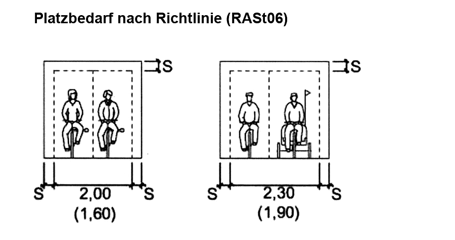Während für Fahrspuren von Menschen mit starken Fahrzeugen vom breitesten Maß (2,55 m) ausgegangen wird und sich immer mindestens zwei Menschen nebeneinander in eine Richtung fortbewegen können sollen, wird für den Rest von den schmalsten Maßen ausgegangen. Bei Fußgängern wird – in der Theorie der Planungsvorschriften, natürlich nicht in der Praxis ihrer Anwendung – stets davon ausgegangen, dass zwei nebeneinander gehen bzw. sich begegnen können sollen, während Radfahrer auch einzeln fahren sollen.