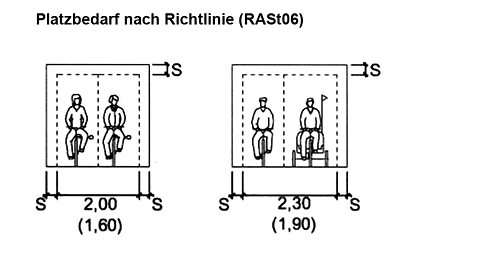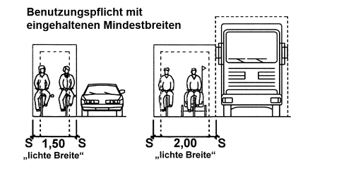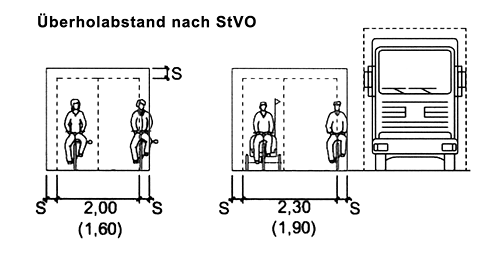 Die in den ERA/RASt gezeigten Illustrationen (vgl. Bild 7 bis 9) suggerieren großzügig bemessene Radwege. Geht man jedoch von der in der Rechtssprechung zu findenden Breite eines Radfahrers von 75 cm plus 25 cm »Schwankungsbreite« nach beiden Seiten aus, stellt sich die Sachlage schon anders dar. Eine Einhaltung des nach der StVO benötigten Sicherheitsabstandes von anderthalb Metern ist beim Überholen selbst auf zwei Meter breiten Radwegen nicht möglich. Mit ausladendem Gepäck oder einem mitgeführten Kinderanhänger verschärft sich die Problematik noch. Dabei genügen zahlreiche Radwege in der städtischen Wirklichkeit bei weitem noch nicht einmal den Mindestmaßen.