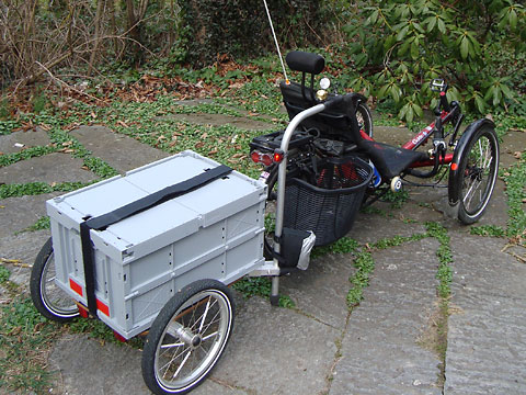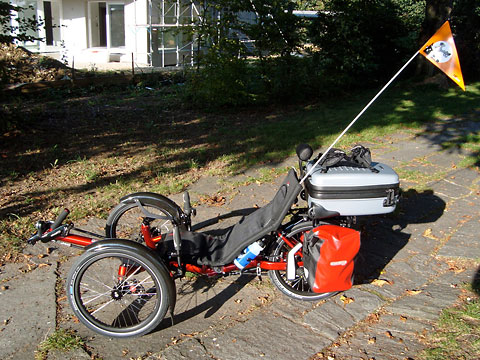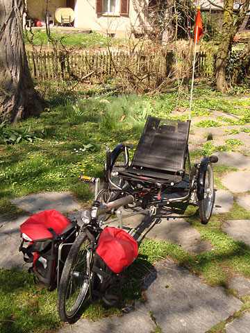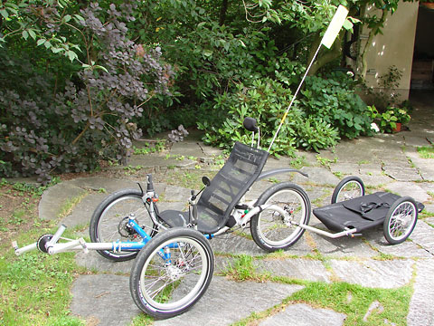 Es wäre gut, ein Liegetrike zu haben, das sich zerlegen, in einer Tasche verstauen und so kostenlos im öffentlichen Nahverkehr mitnehmen ließe. Mit einem zweiten Liegetrike wäre es auch möglich meinen Vater zu begleiten. Recherchen im Internet führen zu Thomas Lösch, der ein zerlegbares, zur Tadpole-Familie gehörendes ICE Trice Q im Angebot seines »velowerks« hat.