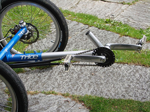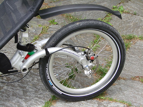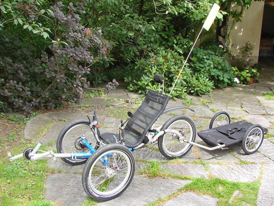 Wir erarbeiten ein auf meine Bedürfnisse ausgerichtetes ICE Trice T mit dem gegenüber dem Q etwas höheren Sitz, mit Schnellspannern leicht zerlegbar, aus Gewichts- und Volumengründen beim Verpacken ohne vordere Schutzbleche, Gepäckträger und Beleuchtung. Die weitere Ausstattung beinhaltet mechanische Avid BB7-Scheibenbremsen an allen drei Räder (die am Hinterrad als Regulierbremse für längere Gefälle und als Parkbremse zum Feststellen mit einem Rasterhebel), eine Schlumpf High-Speed-Drive-Tretlagerschaltung vorne, eine 8-gängige Nexus-Nabenschaltung hinten und 60 mm breite Schwalbe Big-Apple-Ballonreifen. Auf die Beleuchtung verzichteten wir auch deshalb, weil wir die der Zerlegbarkeit geschuldeten Steckverbindungen als störungsanfällig betrachten und ich das ICE nur bei Tag und trockenem Wetter fahren will. Anstelle des Gepäckträgers bestelle ich zwei große Taschen seitlich am Sitz und einen Radical Cyclone-Anhänger.