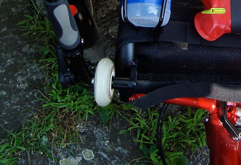 Als Flop erweisen sich die Transportrollen unter dem Sitz; sie ärgern mich bereits auf dem Freiburger Kopfsteinpflaster und bleiben an den Bahnhöfen sogar in den Leitlinien für Sehbehinderte hängen. Abhilfe schaffe ich mit längeren Schrauben, Distanzhülsen und Inline-Skater-Rollen außen am Sitz. Nun lässt sich mein Gekko auch gefaltet einigermaßen problemlos rollen.