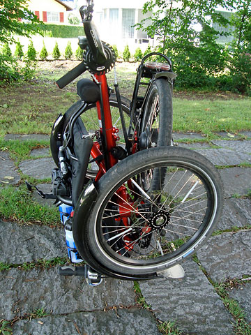 Längere Zeit stehen nun das ICE und das Gekko nebeneinander in der Garage und erlauben Vergleiche. Es stellt sich heraus, dass die um wenige Zentimeter abweichende Geometrie des Gekko zusammen mit dem Gepäckträger und der relativ schweren NuVinci-Nabe genügt, dass beim Gekko auch bei scharfem Bremsen das Hinterrad nicht abhebt. Die Kombination Schlumpf High-Speed-Drive und NuVinci N360 erweist sich als äußerst komfortabel, ich fahre immer in der optimalen Übersetzung und regle intuitiv nach. Verblüffend ist immer wieder, wie ich mit konstanter Kraft und Frequenz in die Pedalen tretend, die NuVinci hochschalte und fühle, wie ich schneller werde. Dieser Fahrkomfort ist sensationell, auch wenn ich weiß, dass die Kombination aus Schlumpf High-Speed-Drive und NuVinci N360 etliche Prozent an Wirkungsgrad kostet. Aber ich fahre ja vor allem auch deshalb Velo, weil es für mich die mir am besten zusagende und in den Alltag integrierbare Form ist, »Hüftgold-Diesel« zu verbrennen. Das Falten und Entfalten des Gekko geht nach etwas Übung recht flott; trotzdem falte ich es weniger oft als gedacht für den Transport im öffentlichen Nahverkehr, da es einfach mehr Spaß macht, es zu fahren.