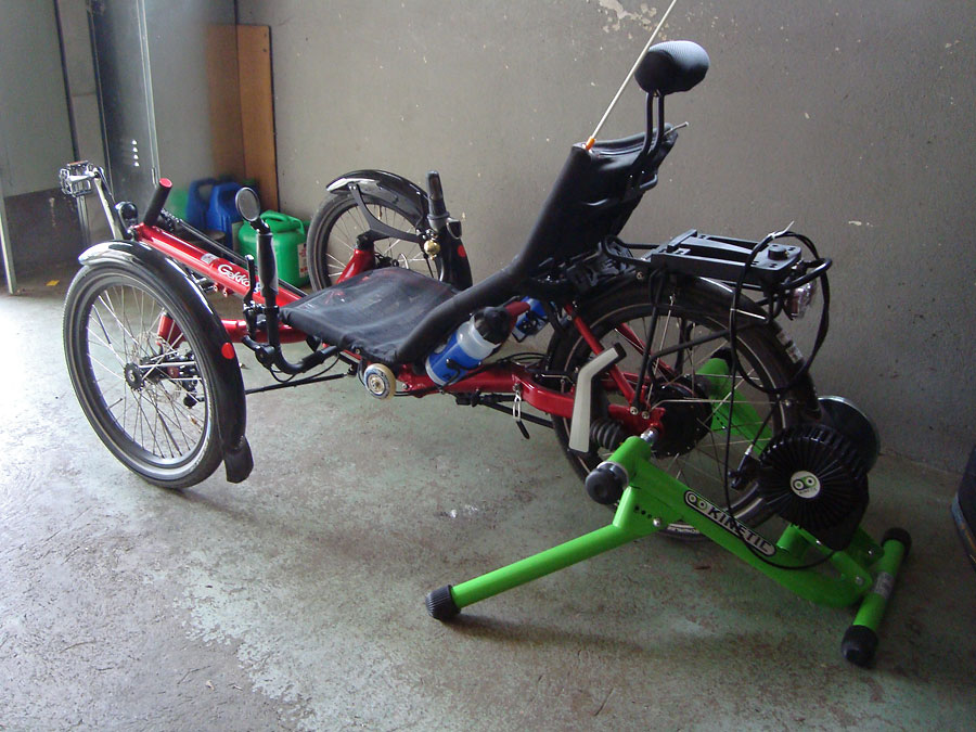 Da ich mein Gekko bei vom Winterdienst gesalzenen Straßen grundsätzlich in der Garage lasse, kommt es im Winter zu einem Konditionseinbruch. Deshalb kaufe ich mir noch einen KINETIC T-699C Rollentrainer mit Small-Wheel-Adapter für das 20»-Hinterrad des Gekko. Das Hinterrad läuft darauf nur ca. 1 cm über dem Boden, d. h. die Geometrie wird kaum verändert und ich kann auch das Aufstehen aus der niedrigen Sitzposition üben. Damit kann ich im Winter und bei längeren Schlechtwetterperioden in der Garage ein gewisses Grundtraining aufrechterhalten. Allerdings wird das eine Notlösung bleiben, draußen zu fahren macht einfach viel mehr Spaß.