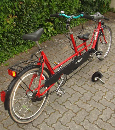 Um auch später noch eine räumliche Trennung zu ermöglichen, wurden nun die weiteren Möglichkeiten des nicht-automobilen Kindertransportes außerhalb eines Kinderanhängers eruiert. Die kleine Tochter kam in einen herkömmlichem Kindersitz auf das Fahrrad der Mutter. Für den mittlerweile etwa 3 1/2 Jahre jungen Sohn hatte ich in einem Artikel der »Radwelt« (ADFC) vor Jahren ein auf den ersten Blick besonderes Rad gefunden: ein Kindertandem. Für mich als engagierten Tandemfahrer war ein Tandem ohnehin sehr naheliegend. Umrüstsätze für Normaltandems für Erwachsene waren aus meiner Sicht aber nicht sinnvoll, insbesondere natürlich nicht für ein so kleines Kind. Erst durch eine Internetrecherche fand ich dann heraus, dass es solche Kindertandems tatsächlich auch real zu kaufen gibt, nachdem ich vorher noch nie eines auf der Straße oder auf einer Fahrradmesse gesehen hatte.