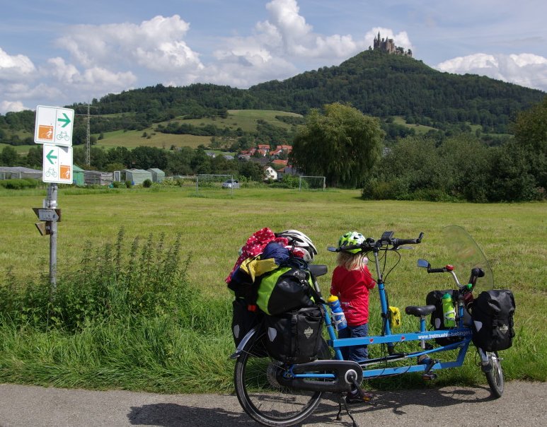 Achtung bei schwerbeladenen Kindertandems: Sofern man in der Gruppe fährt sollte vielleicht das Kindertandem aus Sicherheitsgründen etwas Gepäck an andere Fahrräder abgeben. Meine Devise für durchschnittliche Radler: Ein Kind vorne und ggf. etwas Gepäck in Gepäcktaschen sollte zunächst reichen. Muss mehr Gepäck mitgenommen werden oder auch mehr Kinder, sollten diese Aufgaben an andere Radler in der Gruppe verteilt werden.