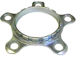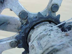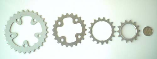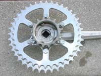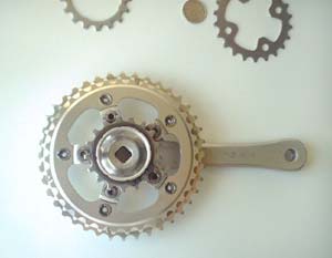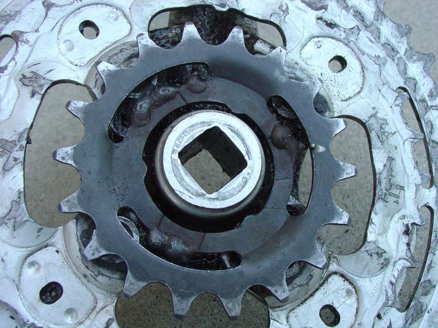 Hierzu wurden 6 Nirohaltearme mit einem passend gedrehten Trägerring verschweißt, auf den wiederum das Ritzel mit Silberlot aufgelötet ist. Diese Konstruktion ist etwas zu »leicht« dimensioniert. Als das erste Ritzel verschlissen war und erneuert werden sollte, wurden mehrere Haarrisse im »Spider« entdeckt – Totalschaden dieses Modells. Die durch die übertragung des Antriebsmoments erzeugten Schubkräfte an der Befestigung kleiner Blätter sind sehr groß (je kleiner der Befestigungsdurchmesser, desto größer). Deshalb müssen solche kleinen Kettenblätter solider befestigt sein als z. B. Zweifachkettenblätter an Profirennrädern mit ihren vergleichsweise riesigen Lochkreisen.