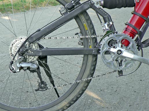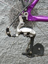 Der Besitzer dieses Rades fährt gerne flott und bevorzugt eine Trittfrequenz im Bereich von 80–90 U/min. Die Kombination 44/34 Zähne, mit einer Entfaltung von 2,65 m, ist daher auch für leichte bis mittlere Steigungen geeignet. Nach Abzug der doppelten Gangstufen ergeben sich 21 nutzbare Gänge. Es wird eine 7-fach-Kassette von Shimano mit 13–34 Zähnen verwendet und ein zusätzliches Abschlußritzel mit 11 Zähnen. Es gibt von Shimano verschiedene Abschlussritzel mit unterschiedlich breiten Zähnen. Breite Zähne behindern die Kette am nötigen Schräglauf, um auf das 13er Ritzel zu wechseln. Entweder man schleift die Zähne an der lastabgewandten Seite an den Kanten an, oder man nimmt gleich ein Ritzel mit dünnen Zähnen (9-fach). Um die Kette bei diesem großen Übersetzungsbereich zu spannen, besitzt das Schaltwerk ein zusätzliches Spannrädchen. Lediglich wenn die Kette auf dem kleinen Kettenblatt (Granny) liegt, schwenkt der Schaltwerkskäfig soweit nach hinten, daß das zusätzliche Spannrädchen zum Eingriff kommt. Der Käfig für das dritte Rädchen besteht aus Aluminiumblech und wurde zur Geräuschminderung, das Blech ist ein guter Resonanzkörper, mit KFZ-Unterbodenschutz beschichtet. Die Idee mit dem dritten Rädchen ist von alten Suntour-Schaltwerken, wie dem Le Pre oder ARX, entliehen. Der Umwerfer ist ein modifizierter Suntour-Umwerfer. Dazu mehr bei der