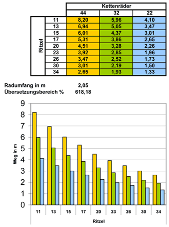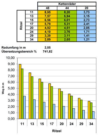 Ein wenig Theorie: der Übersetzungssprung zwischen den beiden größeren Kettenblättern entspricht genau der Quadratwurzel des Übersetzungssprungs der Ritzel. So ist ein Splitten der hinteren Gangstufen möglich. Der Übersetzungssprung von Ritzel zu Ritzel sollte immer gleich sein, z. B. 20 %. Man spricht hier von einer geometrischen Reihe. Da heutzutage fast nur noch fertig zusammengestellte Ritzelpakete lieferbar sind, versuchen wir es mit handelsüblicher Ware.