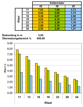 Das kleine Kettenblatt (Granny) liefert die nötigen Berggänge. In diesem niedrigen Geschwindigkeitsbereich ist eine feine Abstufung verzichtbar, da geringe Gangsprünge eine kaum merkliche Geschwindigkeits- und Laständerung bedeuten würden. Im fünften Gang liegt die Kette vorne auf dem mittleren Kettenblatt und hinten auf dem größten Ritzel. Mit 2,29 m Entfaltung können damit auch mittlere Steigungen im Sitzen genommen werden. Erst bei starken Steigungen muß vorne auf das kleine Kettenblatt geschaltet werden.