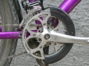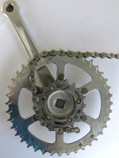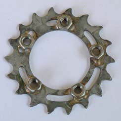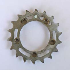 Das 18er Kettenblatt muß selbst angefertigt werden. Hierbei handelt es sich um ein Ritzel des Herstellers Rigida, welches an einigen Stellen durchbrochen wird, um dort Muttern mit Silberlot aufzulöten. Es ist zwar ein noch niedrigerer erster Gang mit einem kleineren Kettenblatt realisierbar, aber die in der Kette auftretenden Kräfte würden die Kette und das Ritzel schnell verschleißen lassen.